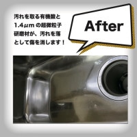 磨き職人は、ステンレスにダメージを与えず水垢を除去する酸を配合。決してステンレスや金属を損傷させません。また、1.4μという非常に細かい藻の化石粒子の研磨材を使用しているので酸性液体による劣化を防ぎ、傷を付けずに汚れを溶かしながら研磨します。